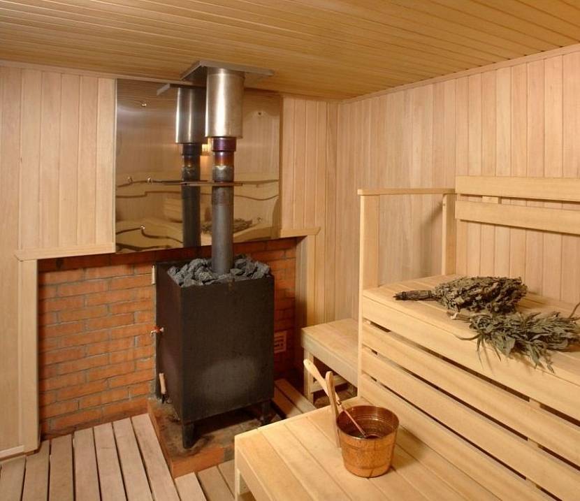 Конструкция подразумевает обязательное наличие бака для горячей воды и сетки для каменки