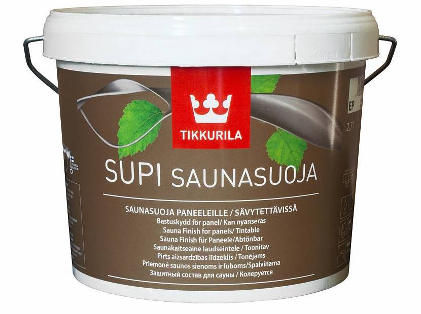 Supi Saunasuoja – пропитка на водной основе с акрилом. Годится для температур свыше 100 °С. Универсальное средство для внутренней защиты парилки. Выпускается как в бесцветном варианте, так и в виде, пригодном для колерования.