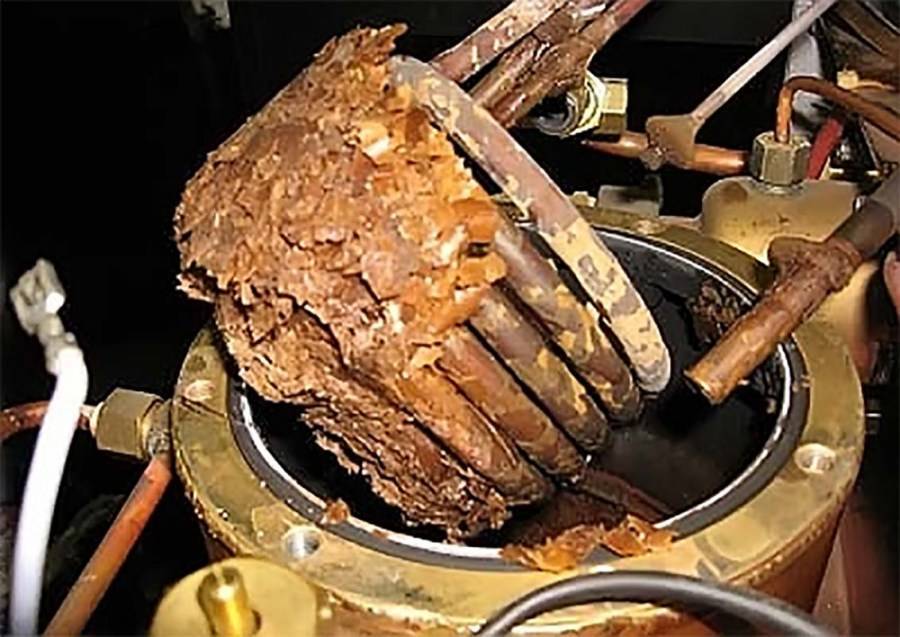Если дача или коттедж с баней находятся в регионе с жесткой водопроводной водой, в котлах образуется накипь. Она откладывается в месте предельного температурного нагрева, снижает скорость согревания воды, существенно снижает проводимость тепла в трубах. Накипь от жесткой воды нарастает постоянно, не равномерным слоем, обладает высоким коэффициентом сопротивления теплу.