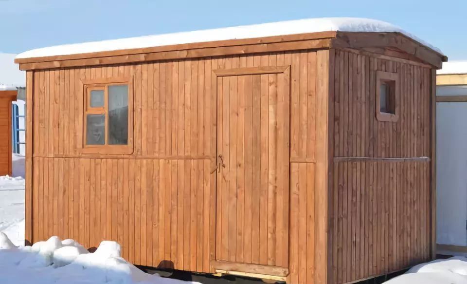 Главным преимуществом такой бани является низкая стоимость и большое внутреннее помещение. Большая часть коробки отводится под хозяйственный блок, где хранятся дрова и дачный инвентарь, парилка и предбанник занимают примерно 2/3 помещения.