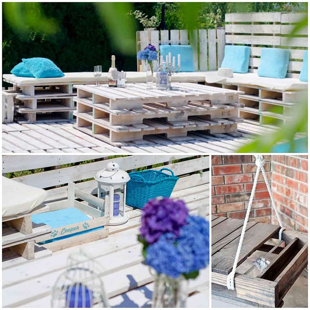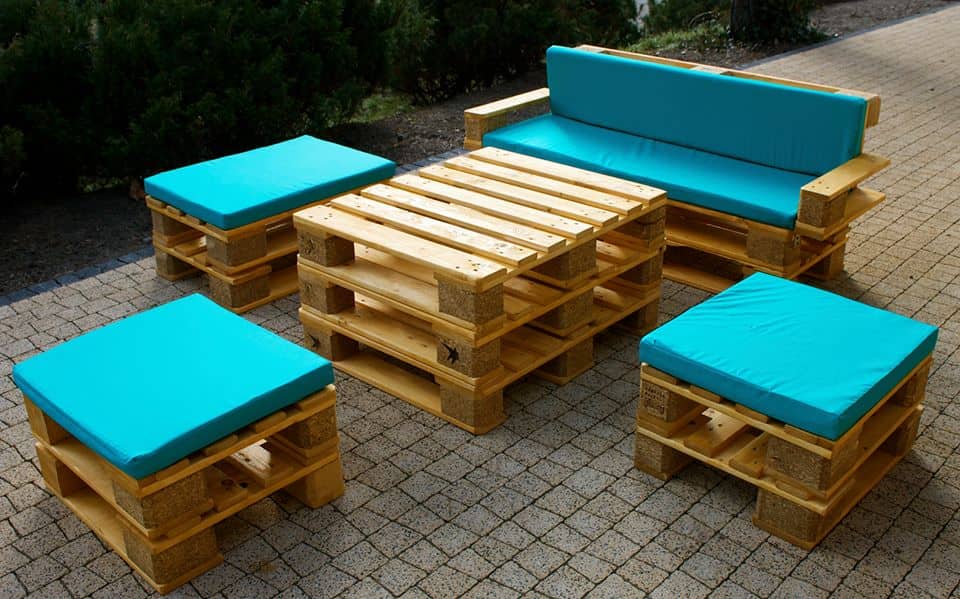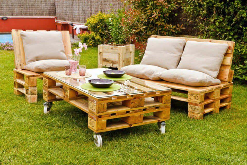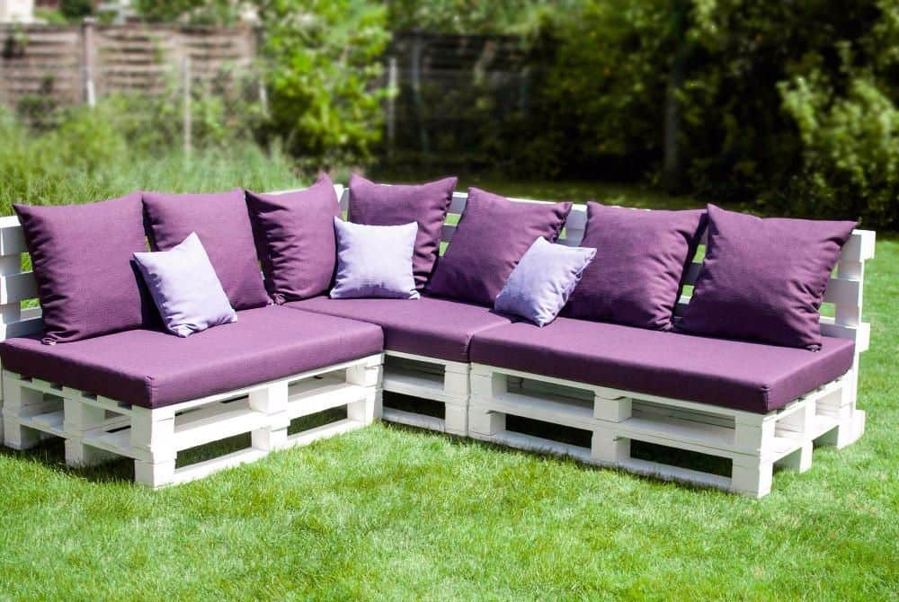 Также достаточно популярной является деревянная мебель сделанная из поддонов. Такую конструкции очень просто сбить, покрасить и пропитать. Подушки также можно пошить самостоятельно или купить в магазине садовых аксессуаров.