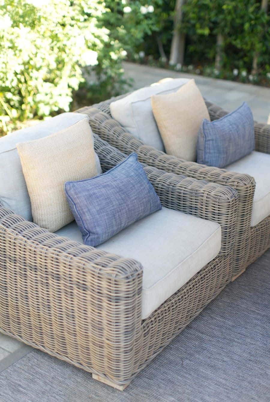Столовая мебель в саду — это еще не все. Чтобы полноценно наслаждаться приятным отдыхом среди цветущей зелени, необходимо купить еще и полный комплект меблировки. Наборы включают в себя диван, два кресла или стулья, плюс невысокий журнальный столик. Самые модные считаются конструкции, выполненные из ротанга, усыпанные большими подушками.