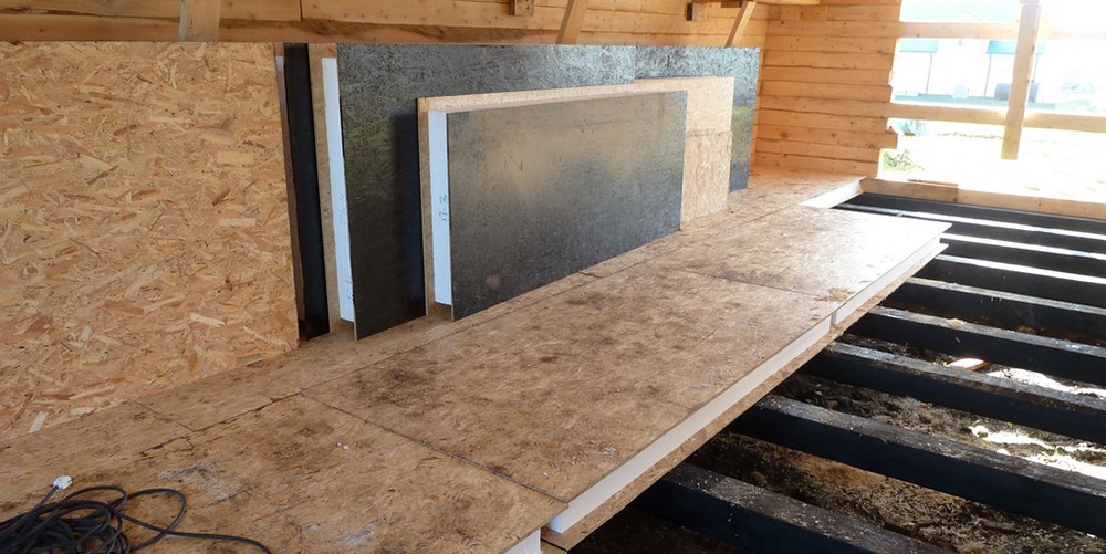 - Потолок выкладываем двумя слоями ОСП в шахматном порядке.