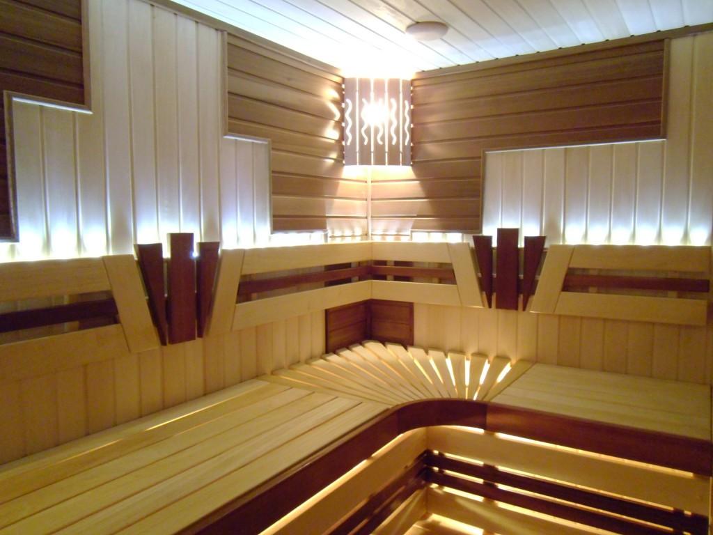 Помещение парилки в любом проекте отделывается вагонкой ольхи или осины, скамейки из липы, пол из кедра. Если вход в парное отделение отделен от предбанника помещением душа, то комнату отдыха облицовывают обычной шпунтованной доской.