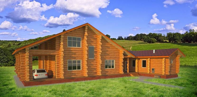 Одноэтажный дом с мансардой, навесом под машину и пристроенной баней