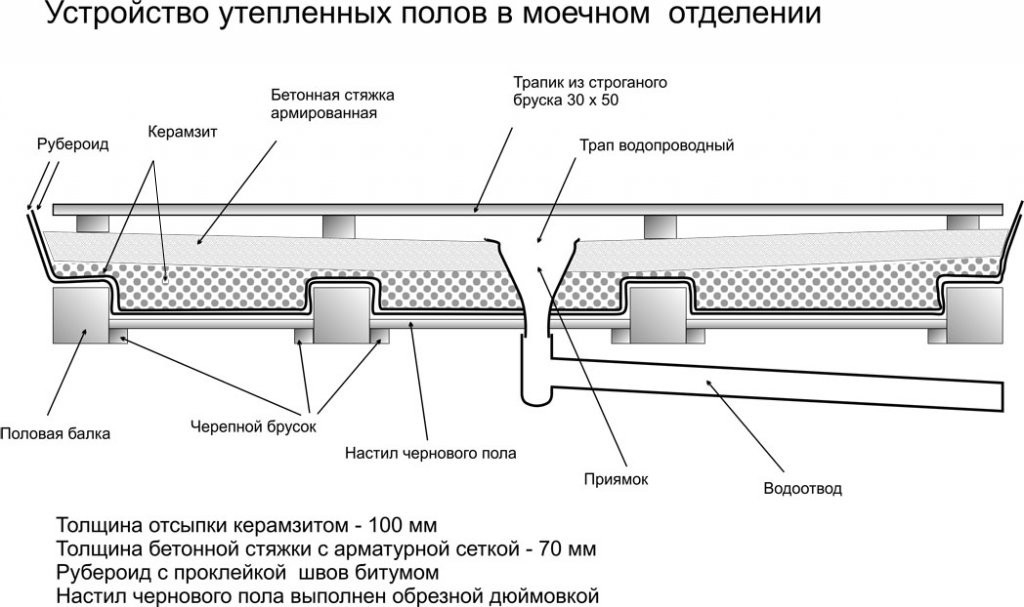 Но чтобы в бане с протекающим полом можно было париться круглый год, то сооружают комбинированную конструкцию. Для защиты подпола от скопления влаги можно в нем соорудить бетонную стяжку в виде конуса, с канализационным стоком посередине. Если захотите ее утеплить, то до заливки бетона нужно уложить керамзит. Хотя он может замешиваться и непосредственно в раствор. Иногда, для экономии бюджета, бетонную стяжку заменяют замком из глины толщиной 8–11 см. Бетонную конструкцию нужно периодически мыть, обрабатывая специальными составами, для предотвращения неприятного запаха и возникновения вредных микроорганизмов.