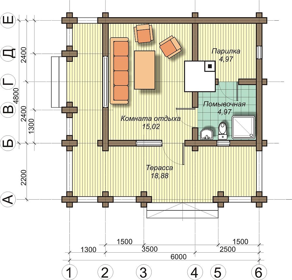 В состав стандартной бани входит коридор, предбанник, моечная комната и парилка.