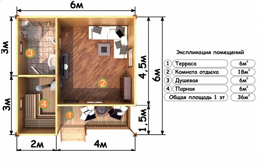 Баня размером 6 х 6 не очень большая для сооружения полноценного бассейна и бильярдной, но и совсем не маленькая – в ней свободно будет себя чувствовать компания из 8 человек.