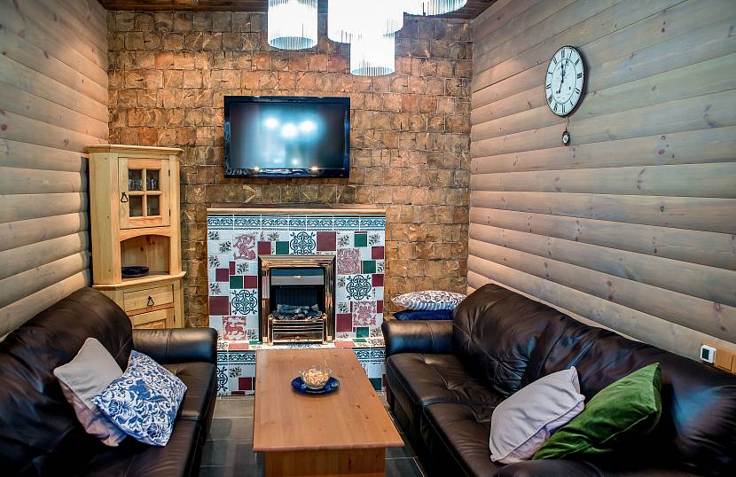 - Комната отдыха в 10,3 м2 содержит всё необходимое: небольшой угловой диван, камин, стол и рабочую кухонную зону, где можно по-быстрому сервировать закуску.