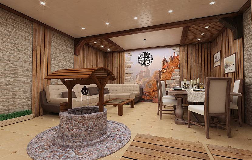 Натуральный или искусственный камень для стен. Материалы обладают не только уникальным внешним видом, но и имеют высокую практичность. Декорированные стены комнаты для отдыха продолжительное время сохраняют привлекательный внешний вид длительное время. Не склонны к повреждению под воздействием высокой температуры, высокой влажности. Чаще всего используется гранит, булыжник, песчаник, кварцит или мрамор. Недостаток – высокая цена и значительный вес.