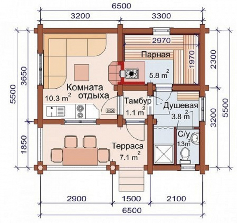 Планировка бани 6,5 на 5,5 м