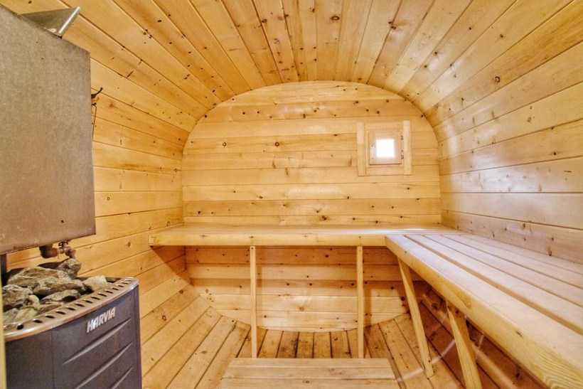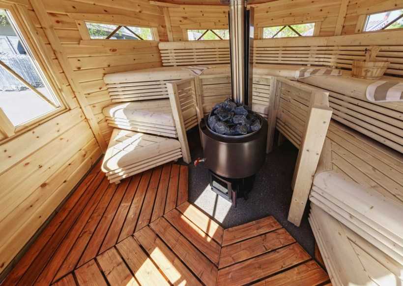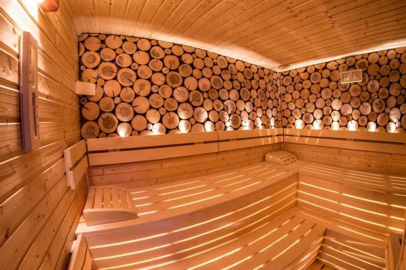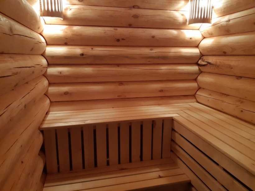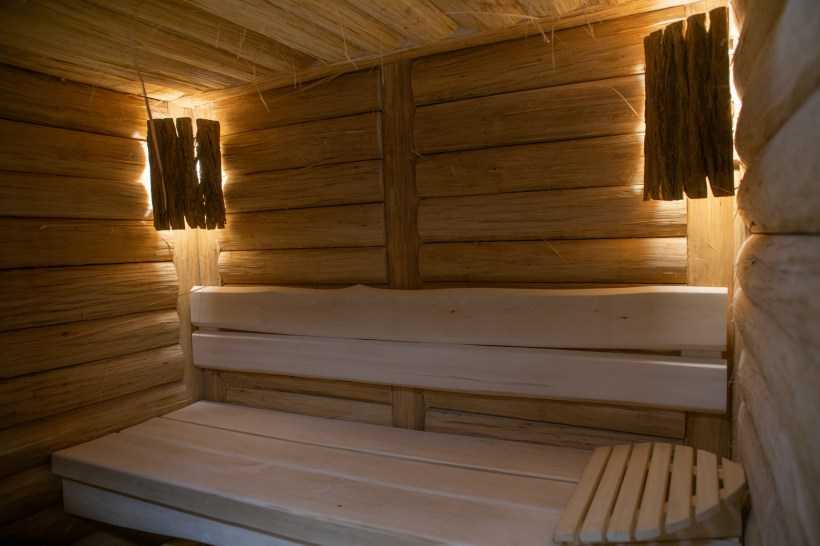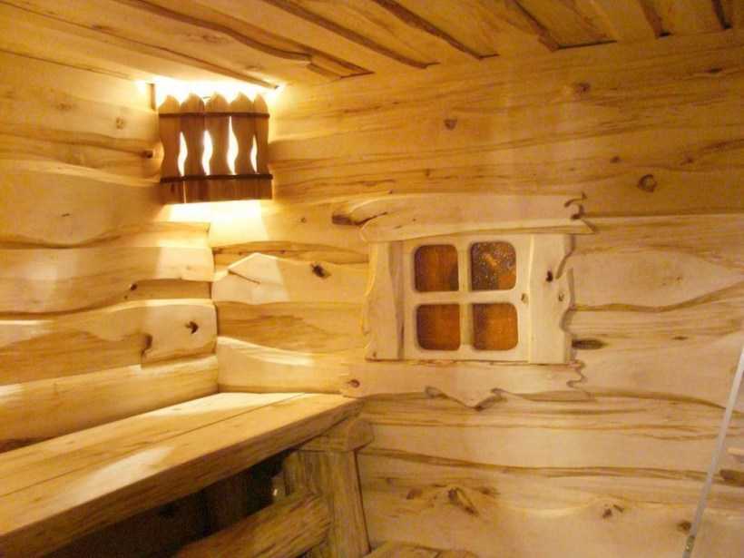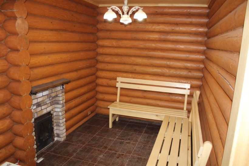 Если баня строится из дерева, стены можно оставить без отделки. Аутентичная атмосфера с открытыми бревнами позволит каждый раз наслаждаться эфирными маслами, которые выделяются из нагретой древесины. А вот зону отдыха можно обустраивать уже на свой вкус.