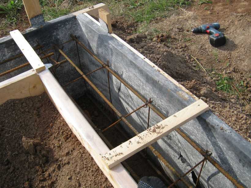 По периметру будущего здания на глубину 1,5 м устанавливаются полые столбы, которые располагаются на дренаже из щебня, заполняются строительной бетонной смесью и оставляются для застывания. После застывания бетонной смеси производится обвязка фундамента деревом, которая впоследствии станет основой будущего каркаса.