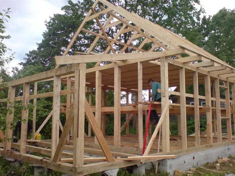 Вторая намного проще в исполнении. Каркас стены из досок сводится отдельно для каждой стены и по очереди устанавливается на деревянную обвязку фундамента, после чего соединяется с ним и всей остальной конструкцией.