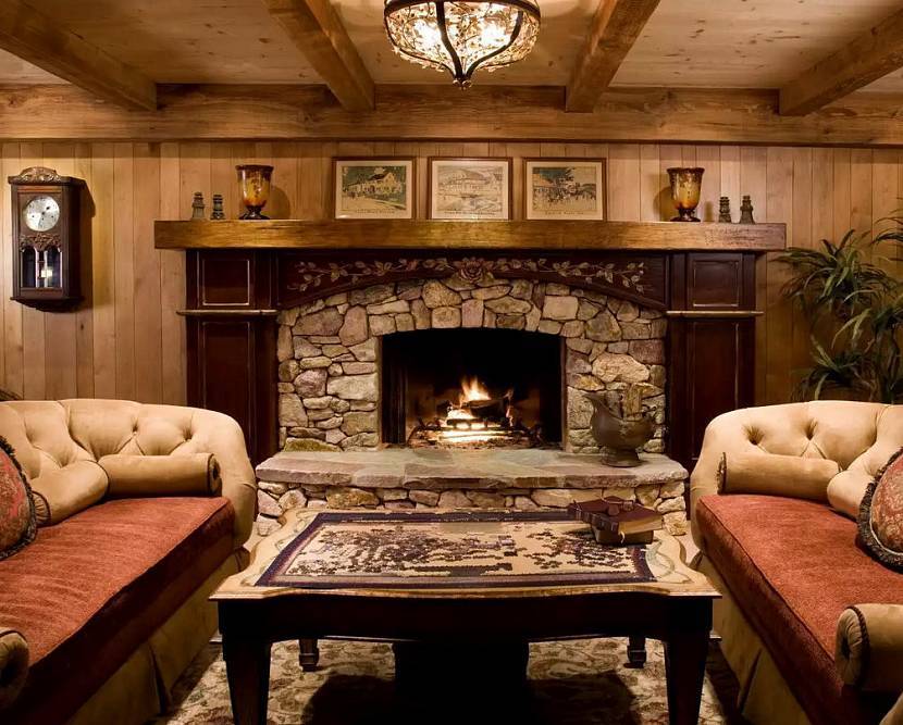 Вокруг камина в домике в стиле шале развешивают старинное оружие, доспехи, охотничьи трофеи, шкуры. На каминной полке размещают свечи в подсвечниках, часы, керамическую посуду. Рядом с камином располагают кованую кочергу, щипцы для поленьев. В интерьер хорошо вписывается поленница – отсек для дров возле камина.