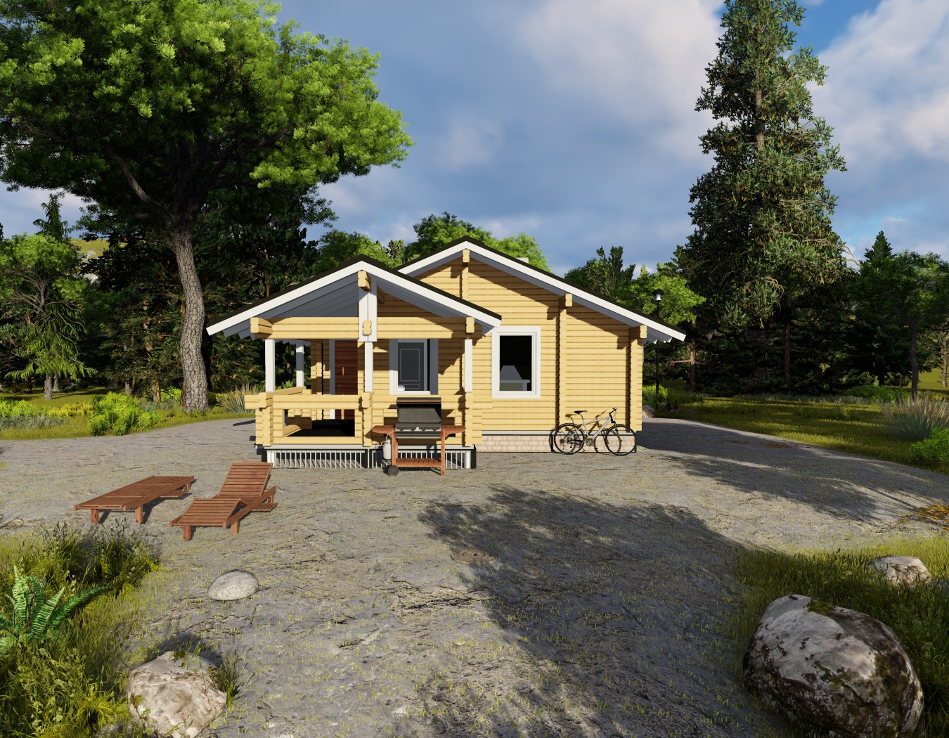 Шале является естественным продолжением природного пейзажа, в тоже время с четкими симметричными линиями стиля.