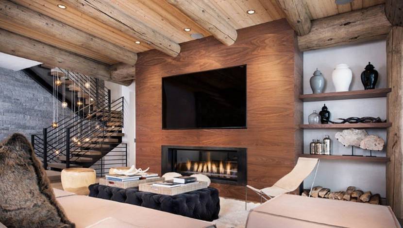 В интерьерах используются простые геометрические формы, без сложных асимметричных конструкций и витиеватых элементов. Стилистика шале скорее напоминает смесь деревенского и классического стилей. В гостиной обязательно устанавливают камин, желательно – большой и настоящий.