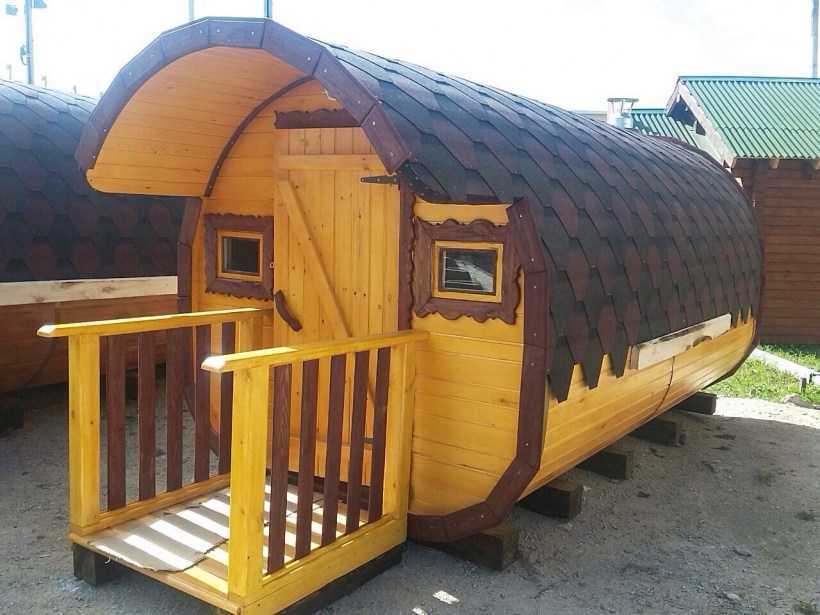 В зависимости от размеров, конструктивных особенностей и назначения, бочкообразные бани разделены на три основных вида. Краткий обзор каждого из них: