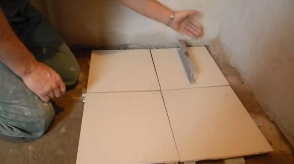 Далее берется уровень, с его помощью с двух сторон делается уклон первой плитки. От того, как она ляжет, зависит вся дальнейшая укладка.