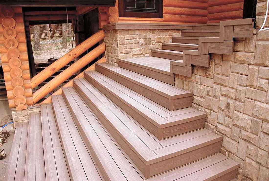 Лестница из ДПК тоже выглядит красиво и в эксплуатации удобна