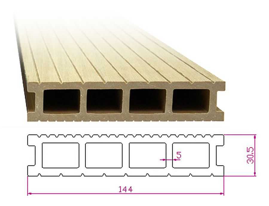 Важен такой параметр, как толщина доски ДПК. Но не сама по себе, а в сочетании с толщиной перегородок и толщиной лицевого слоя. Именно это и придает изделию прочность, отвечает за износостойкость и срок службы. Итак, вот какие могут быть параметры у пустотной террасной композитной доски: