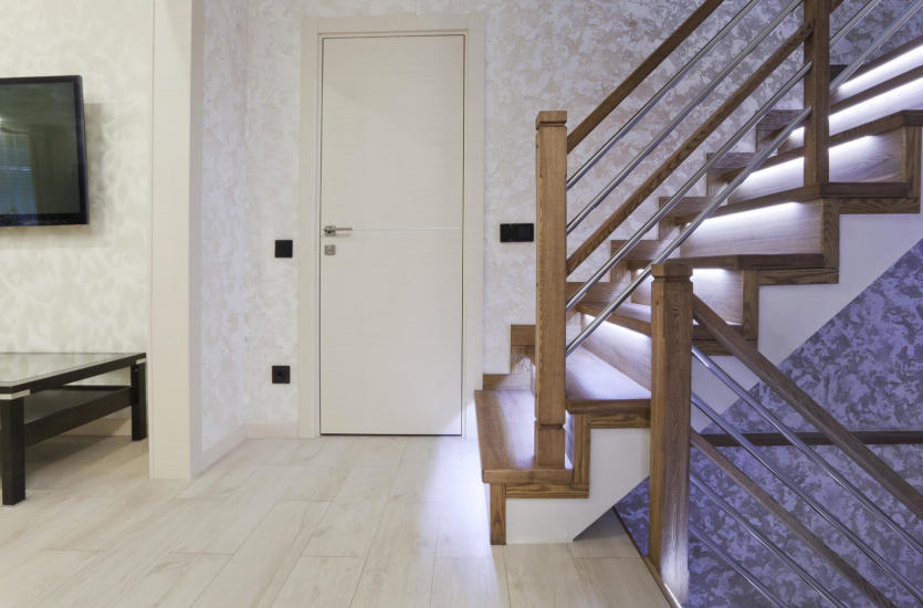 Все лестничные светильники должны быть максимально безопасными в эксплуатации. Освещение может быть потолочным, настенным, локальным и декоративным. При потолочном освещении над лестницей вешают люстры с подвесами или без них. Этот способ идеален для классических интерьеров. Также лестницы можно осветить с помощью настенных бра. Это наиболее простой способ освещения. Для локального освещения характерна подсветка отдельных лестничных участков (например, маршей или площадки). Для этих целей можно взять галогеновые или диодные светильники, интегрированные в систему «Умный дом». То есть они загораются, когда человек находится на ступеньке. Декоративное освещение нужно для придания определенной атмосферы дому. Оно является дополнением к основному освещению и обычно включается во время каких-либо торжеств.