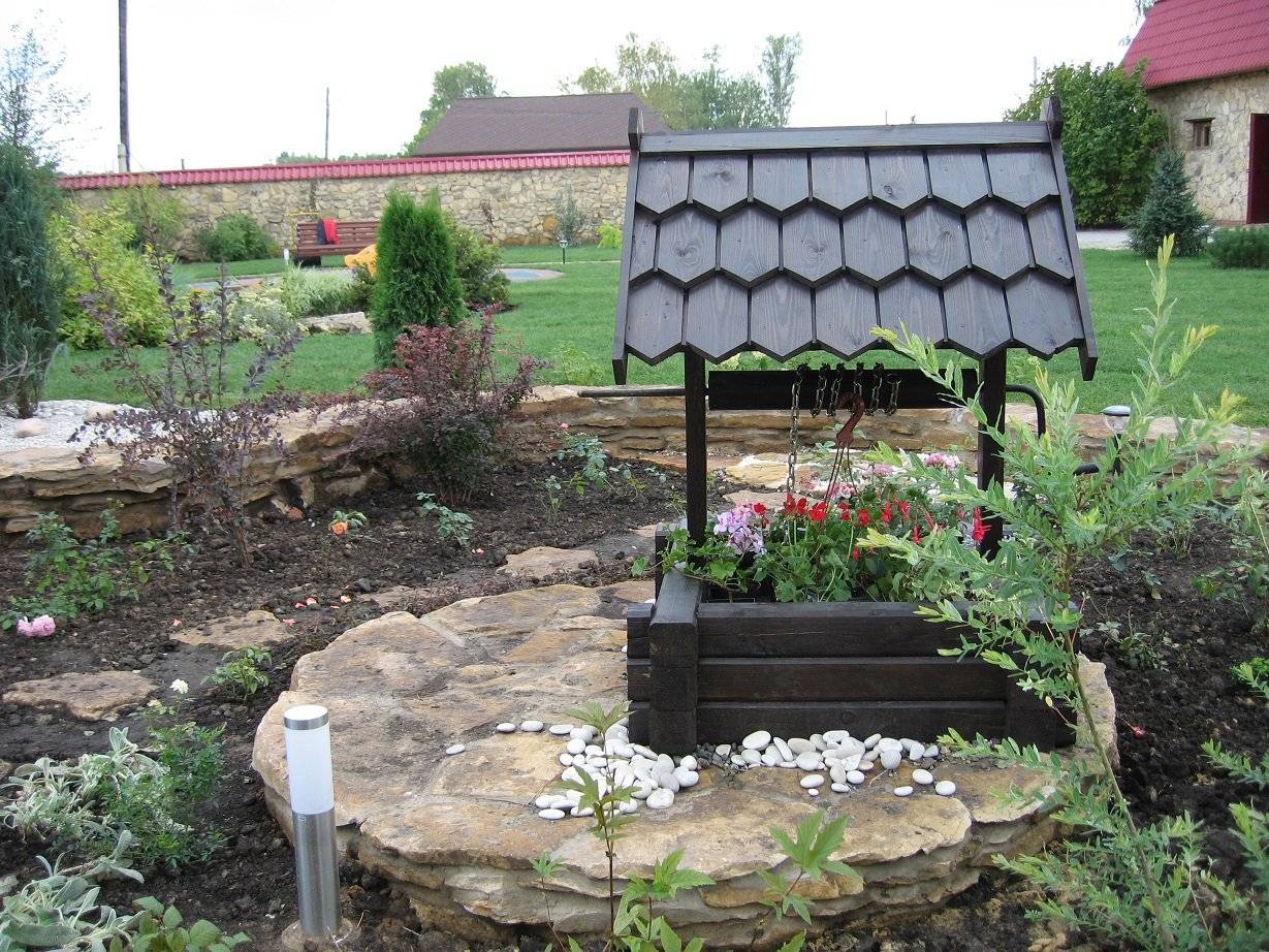 - Декоративные. Используются для украшения участка, а также маскировки инженерных коммуникаций, в единичных случаях – как скважина с питьевой водой. Их можно дополнительно оформлять крышей, на которой высаживают ампельные растения.