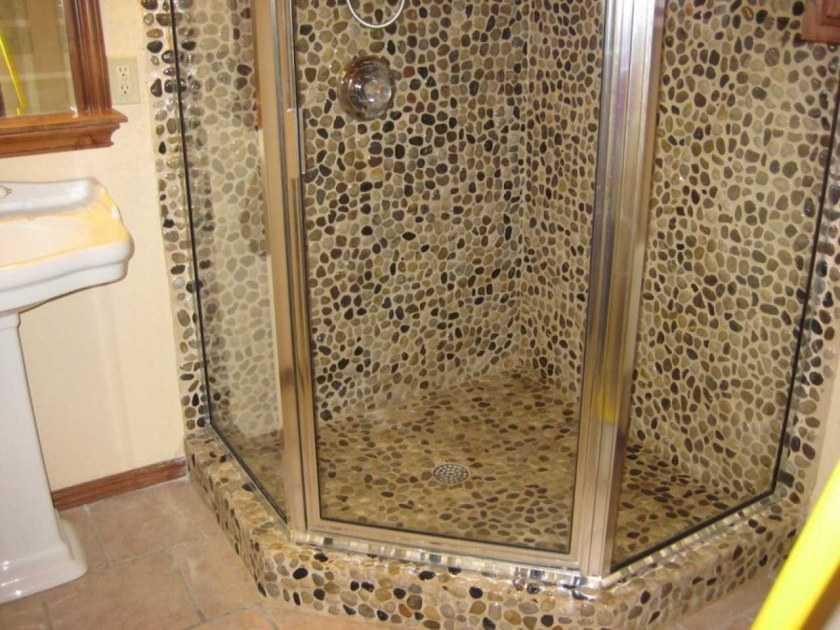 В качестве отделочного материала для поддона можно использовать и разноцветную гальку или другой декор, залив финишный слой прозрачным герметиком.
