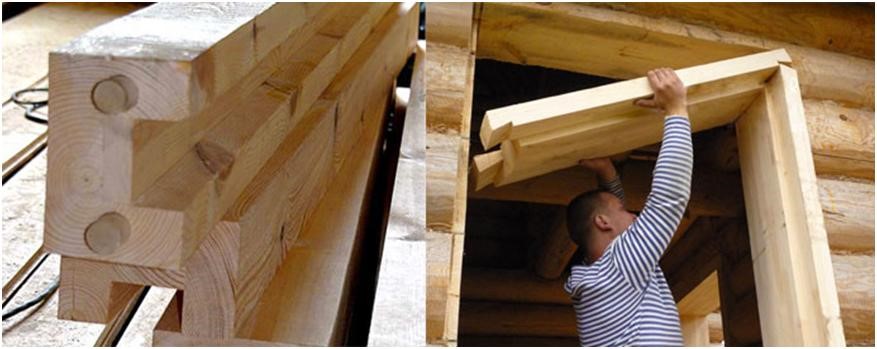 Заметное ослабление конструкции в бревенчатых стенах из-за усушки диктует свои правила по установке окон и дверей. В торцы стен вставляют обсадную коробку или как её ещё называют окосячку по способу «шип-в-паз». Теперь в них можно установить раму (дверную коробку), на которой висит сама конструкция створки. Наличники и доборы закрывают монтажные элементы рамы, завершая чистовую отделку и придавая проёмам законченный вид.