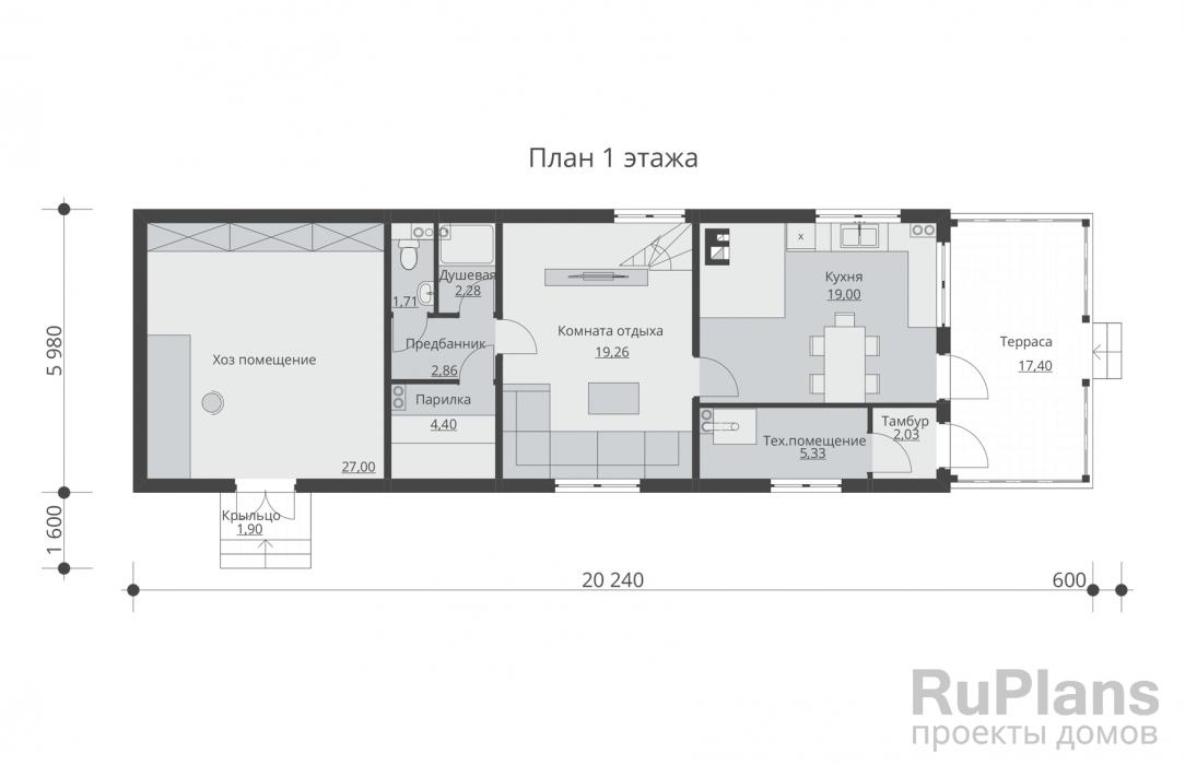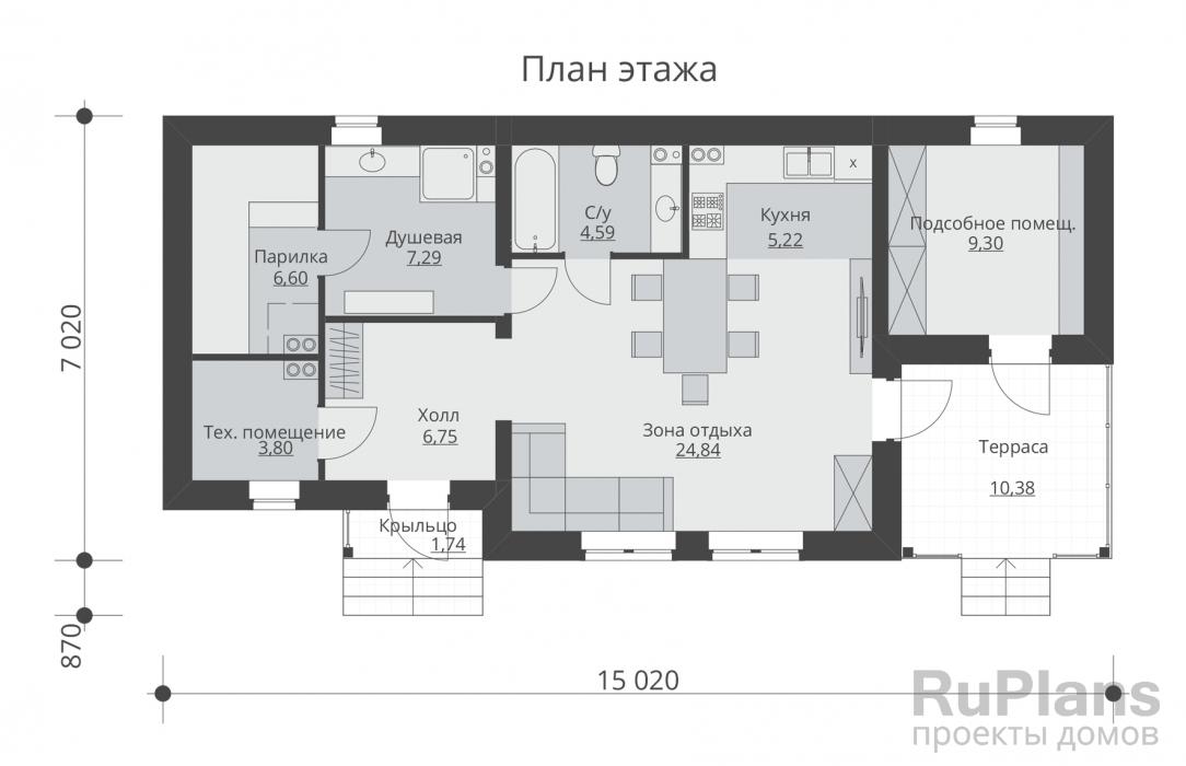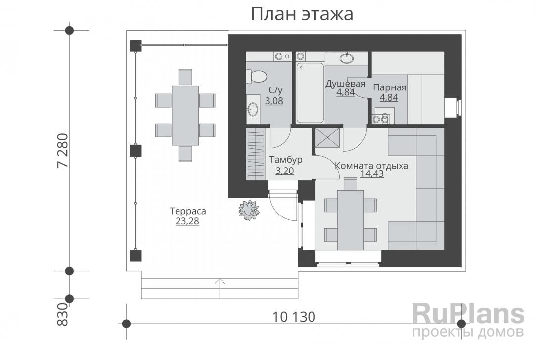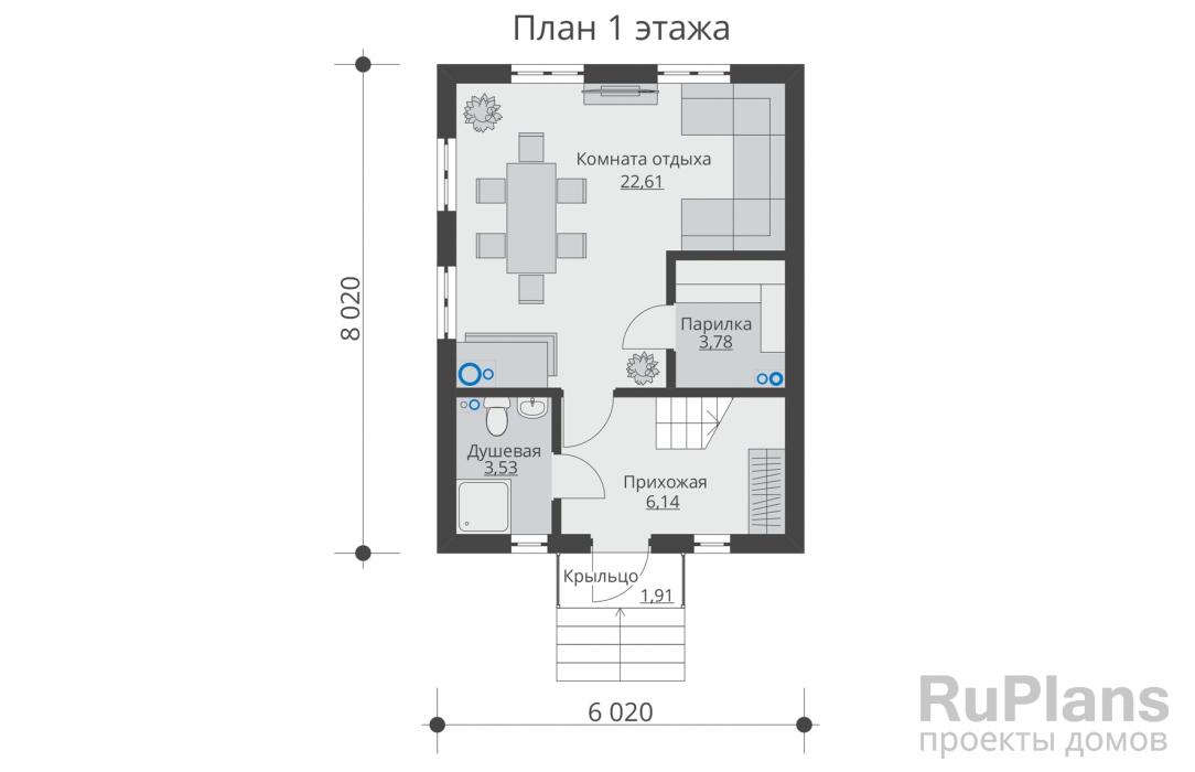В предложенном варианте терраса находится перед баней. Проект предусматривает наличие тамбура, что позволяет устроить прихожую с местом для верхней одежды и обуви. Лестница на второй этаж находится в углу у дальней стены комнаты отдыха. Выход из парной ведёт в мойку, где находится душ, раковина и санузел. Размеры внутренних помещений первого этажа: