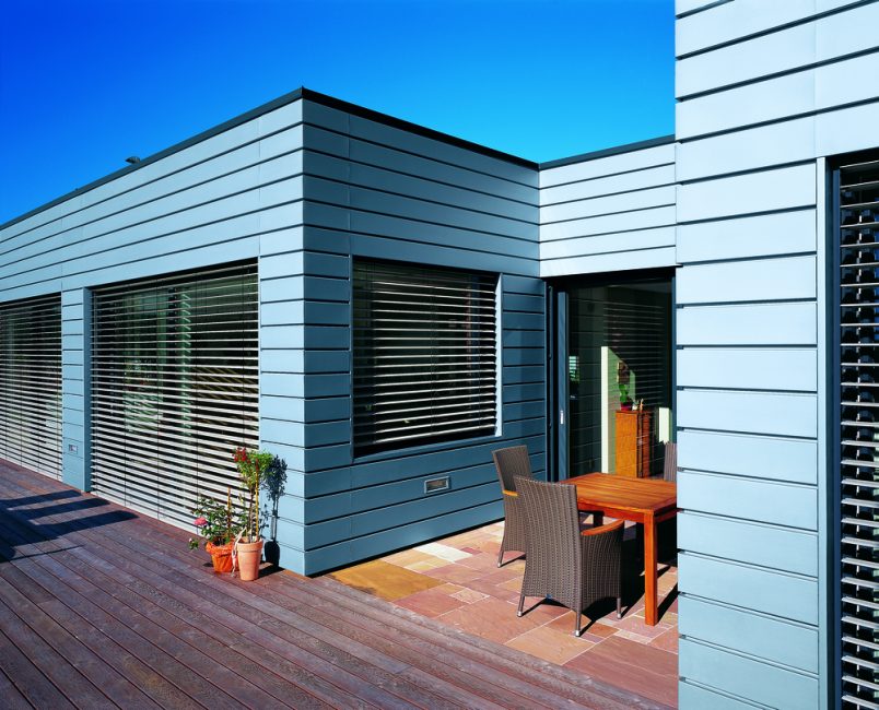 - Чистый металл. Хорошо сочетается со стеклом, отлично подойдет для отделки дома в стиле хай-тек. Придает особый блеск и строгость стиля. Напоминает о небоскребах, промышленных зданиях.