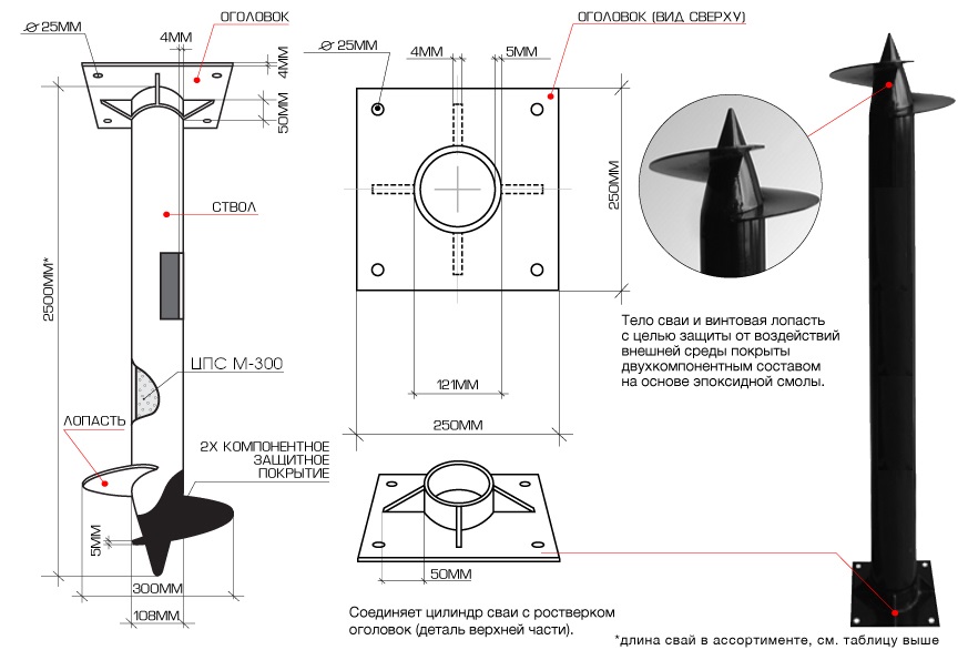 Надземную верхнюю опорную часть сваи составляет оголовок, который закрепляется на ствол после вкручивания сваи в грунт. Он имеет форму квадрата со стороной 50 см. В середине с нижней стороны оголовка располагается небольшой отрезок трубы, который надевается на ствол сваи и приваривается к нему. Место сварки оголовка с трубой винтовой сваи необходимо защитить от коррозии.