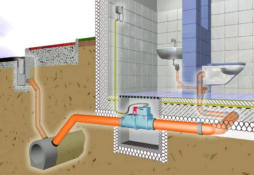 трубопровод, который сквозь отверстие в фундаменте выводится наружу — в