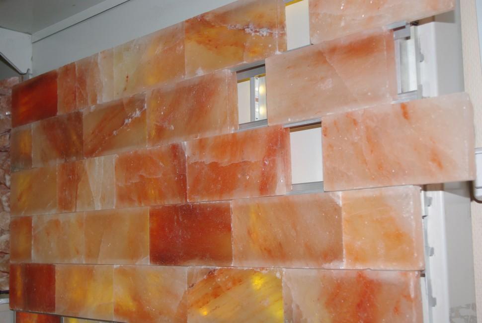 Этот вариант использования гималайской соли — дорогой, но очень красивый. Он подразумевает создание настенных панно из соляных камней и фигурных изделий. Панно прикрепляют к стене или, что предпочтительнее, встраивают прямо в неё.