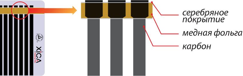 Основа материала представлена лавсановой пленкой. Пленочный инфракрасный пол из углерода монтируется на горизонтальные и вертикальные поверхности.