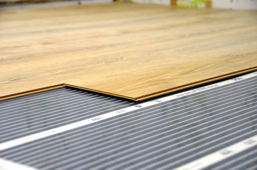 Между ламинированным покрытием и ИК теплым полом надо настелить полиэтиленовую пленку или гидроизоляционный материал. Отрезы надо укладывать внахлест и проклеивать между собой скотчем. Это необходимо для обеспечения безопасности эксплуатации теплого пола и обеспечения защиты от повреждений и избыточной влажности.