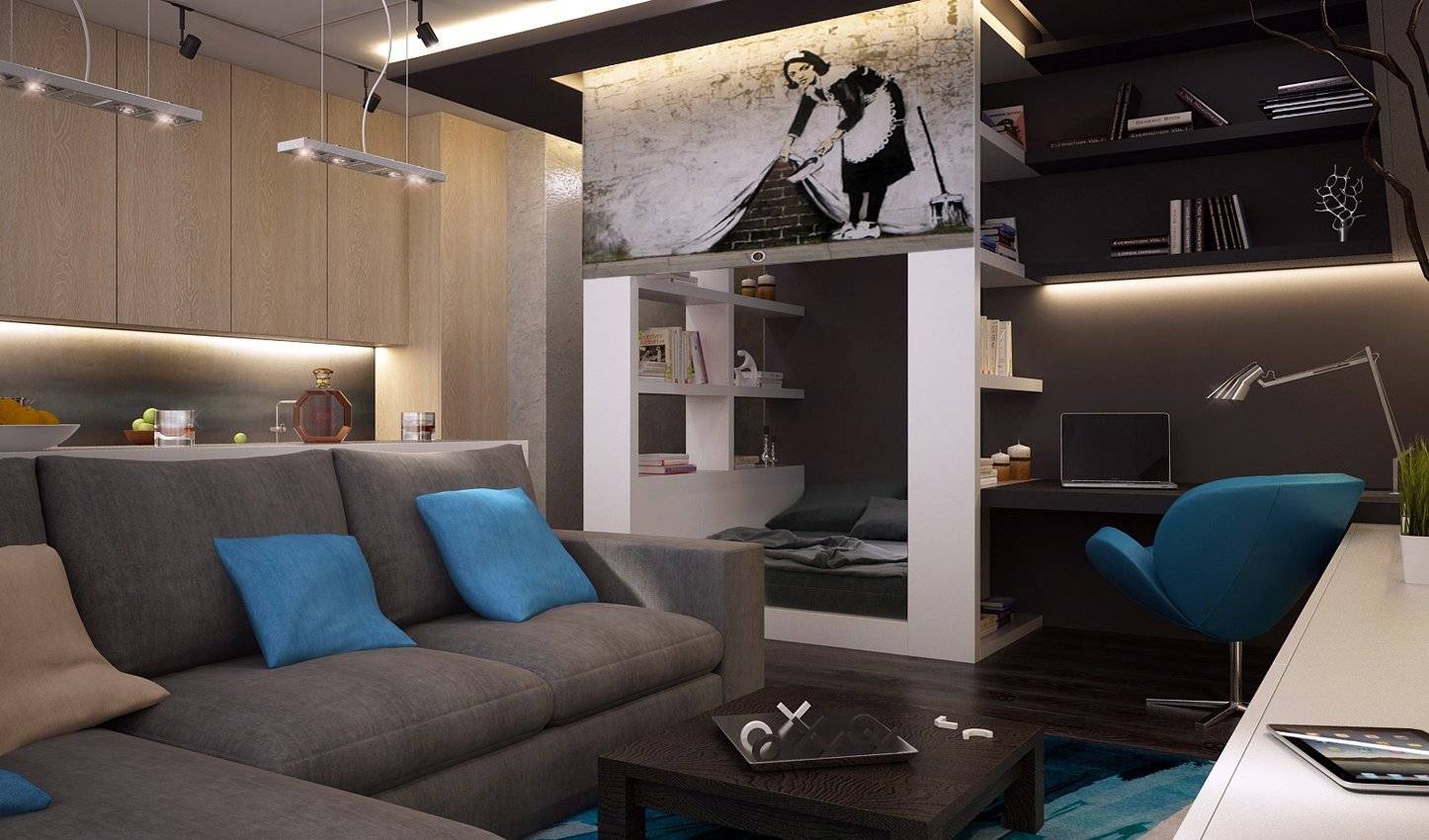 Существуют практичные модели, дополняемые внизу ящиками и полочками для хранения сумок, аксессуаров. Небольшой раскладной диван в зоне отдыха обеспечит возможность ночевки гостей хозяина. А вот кресла (обычные, бескаркасные или же раскладываемые) будут занимать меньше места и при необходимости их можно будет легко переставить.