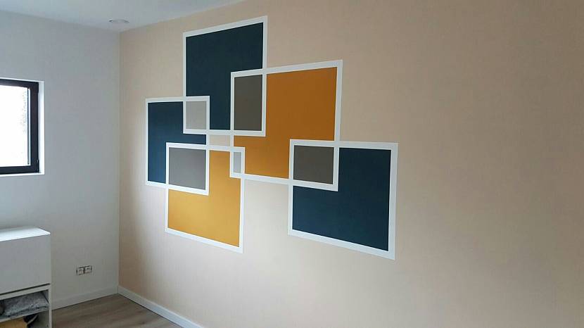 Хаотичное размещение полосок без изломов и дефектов поможет добиться интересного декоративного эффекта. Обычно создают фигурный геометрический орнамент. Внутри получившихся фигур размещают картины в небольших рамках.