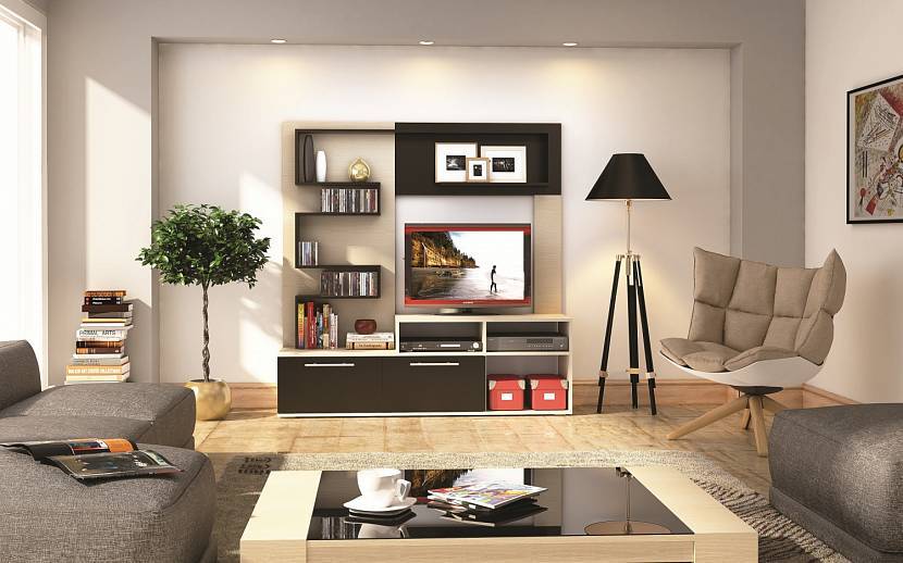 Корпусная мебель гостиной данного направления стиля предполагает выбор металлической фурнитуры, лаконичных плоских фасадов с полированным или лакированным деревом. Приветствуются дверцы с полками из стекла, а также многообразие глянцевых поверхностей. Приоритет получают многоярусные конструкции с встроенными ящиками и креслами-трансформерами. В комнате должно быть много дневного освещения!
