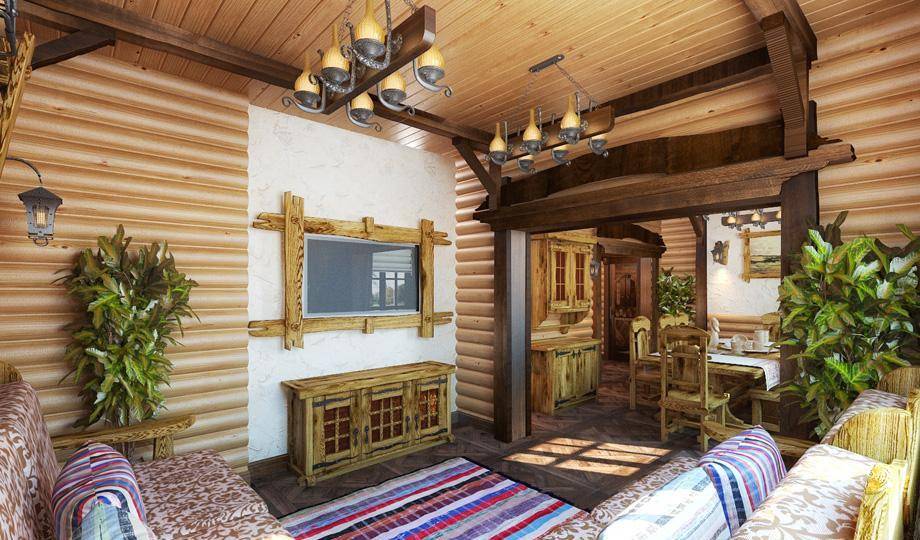 Предбанник получает дополнительную площадь, обставляется диваном, креслами, столом с самоваром. Это помещение часто используют для временного размещения гостей, поэтому оформлению комнаты отдыха придают большое значение: его оснащают приборами для комфортного времяпрепровождения – телевизором, холодильником. Многие предметы декора и обихода для собственной бани хозяева создают своими руками. Внутри или снаружи стены любовно украшают трофеями охоты или резными элементами отделки.