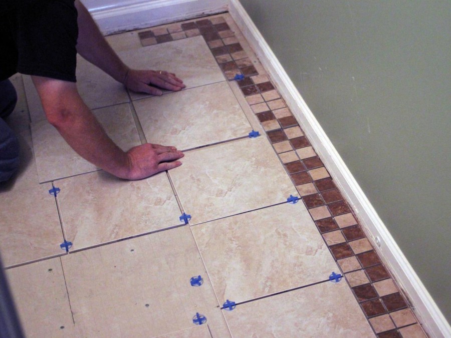 Если начать от одной стены к другой, то у конечной стены может оказаться много подрезанных плиток, которые будут выделяться. Ну а если решено начать от стены, то её нужно разметить напополам. Первую плитку кладут справа от нанесенной разметки.