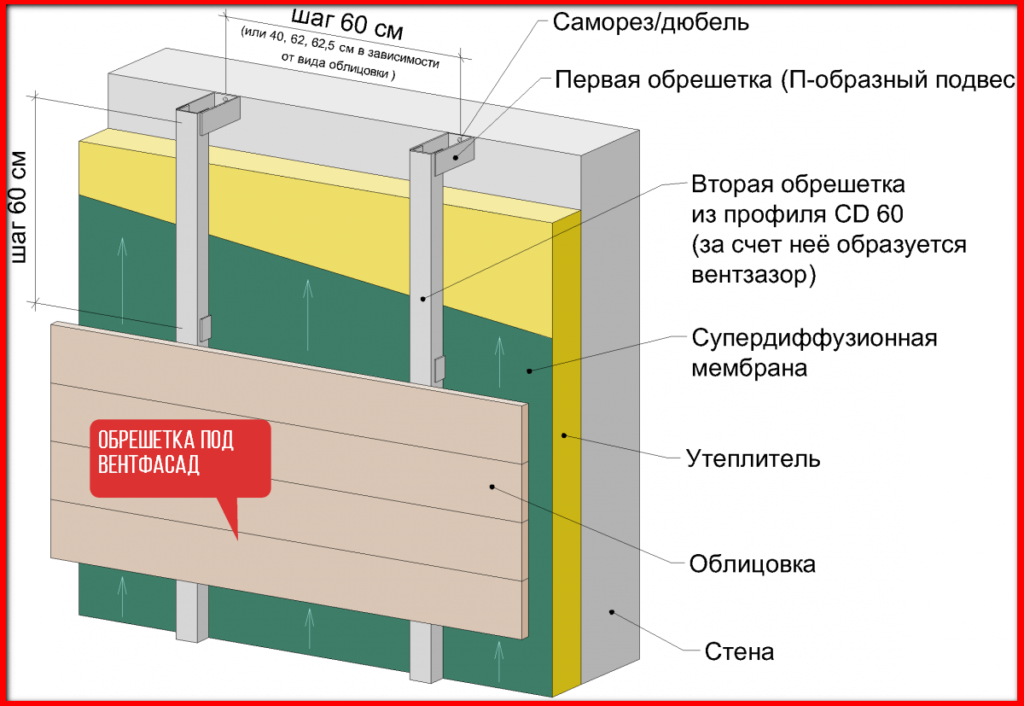 На улице крепление утеплителя с помощью обрешетки делают, когда есть необходимость вентилируемого фасада. В этом случае каркас делают из металлического профиля.