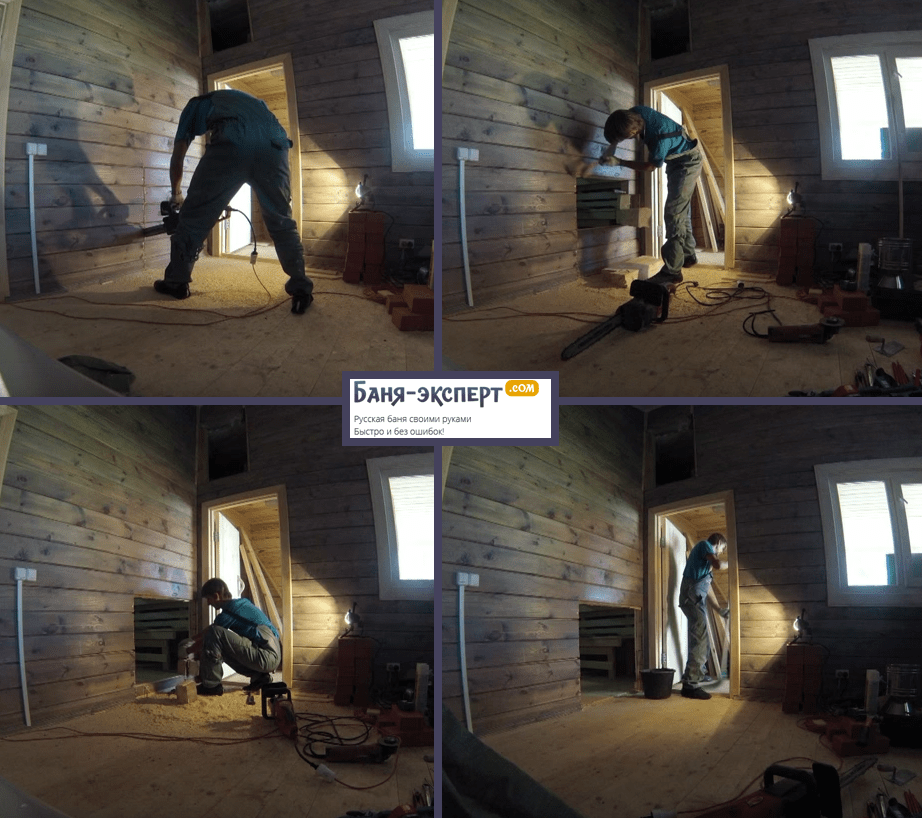 Шаг 4. Берут лист минерита и вырезают в нем отверстие под топку точно по размеру. Во втором листе делают такое же отверстие, после чего устанавливают оба листа изнутри парной к проему. Крепится материал к деревянным стенам саморезами.