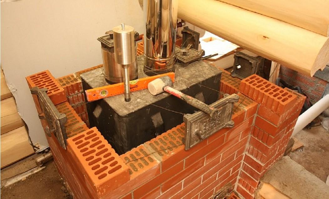 Проём для дверцы оставляют таких размеров, чтобы ничто не затрудняло её использование. Если весь периметр печи расположен в парилке, можно её лицевую часть не закрывать, это тоже влияет на скорость обогрева. Для прочности кладки используют армированную сетку, которую разрезают и вставляют в кладку через ряд. Стыки между кирпичами должны располагаться так, чтобы в верхнем ряду они закрывались сплошным кирпичом. Такая кладка с перевязкой будет прочной.