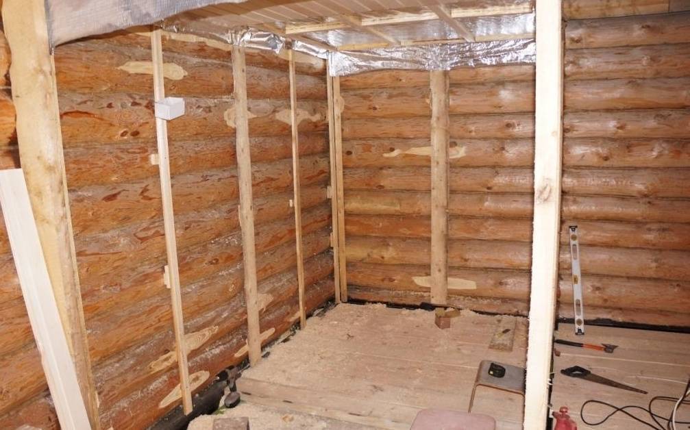 После закрепления основных стоек монтируются меньшие по размеру брусья. Такой вид монтажа обрешетки называют «плавающим», он применяется для жарких, влажных помещений, помогает защитить сруб от деформации.