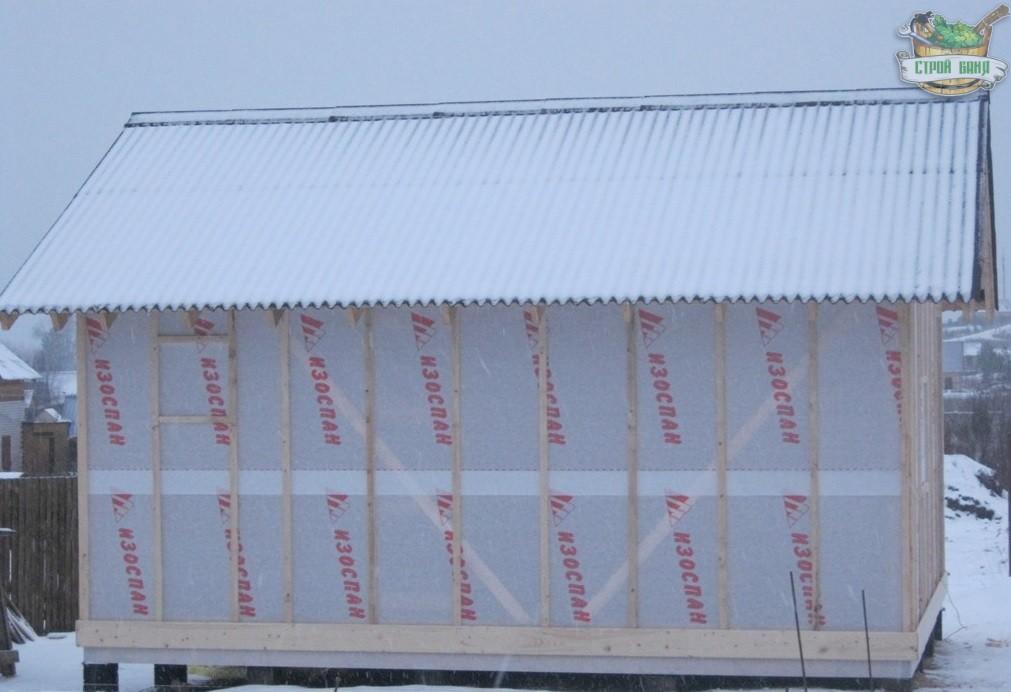 Первым слоем стала ветрозащита и гидроизоляция – пленка «Изоспан А». Ею баня была обшита снаружи, включая стены и фронтоны. Крепление выполнялось степлером на вертикальные стойки.