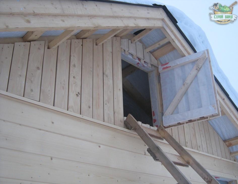 Зашивка фронтонов оказалась более сложным занятием. Вначале был сформирован слой обрешетки (для продолжения вентиляционного зазора на стенах). Затем он был обшит вагонкой, за исключением проема для люка.