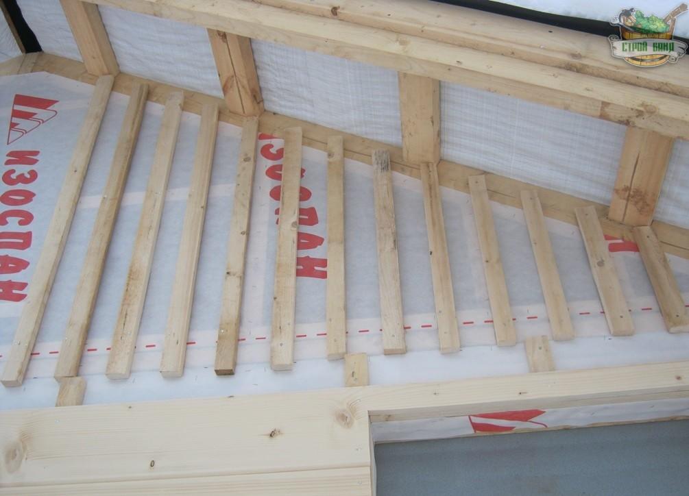 - Чердак каркасной бани делается вентилируемым. Для этого обрешетка приколачивается поверх стропил и определяется кровельным материалом то, как она выглядит. Обрешетка должна быть сплошной для мягкой кровли или кровельного железа. Для металлочерепицы – шаг тридцать пять сантиметров, для ондулина или шифера – шестьдесят сантиметров. При использовании натуральной черепицы при строительстве бани, определяется шаг обрешетки размерами этой черепицы.