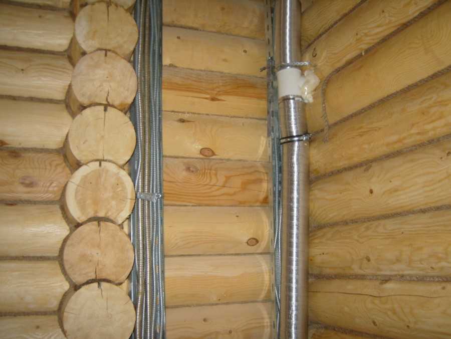 - При наличии деревянных стен, проводка может быть открытой и проходить по поверхности стен.