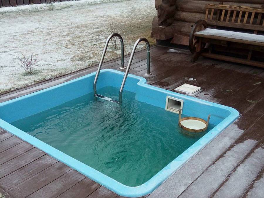 Конструкцию устанавливают так, чтобы сливная труба проходила вдоль стенки и не мешала ходьбе. При желании к стенкам купели крепят небольшие перила и несколько ступеней.